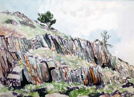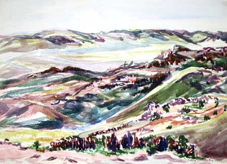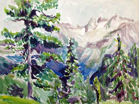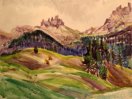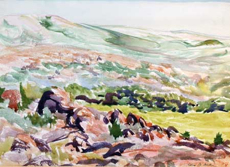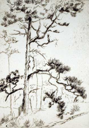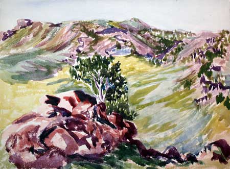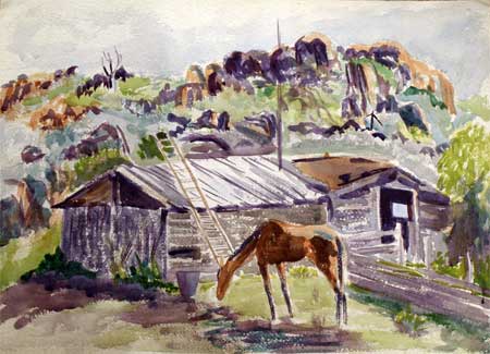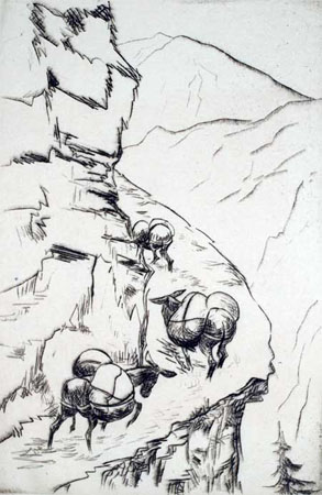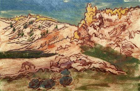 Martin’s love for the outdoors was evident throughout her life and greatly influenced her artwork. Her daily life included horseback riding, hiking, and managing her family farm and all of its animals. During the summers of 1929 and 1931, Martin traveled to Wyoming and produced her most successful body of work. She returned with watercolors and etchings that highlighted the integration of her abilities in draftsmanship, printmaking and composition.