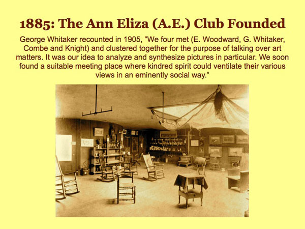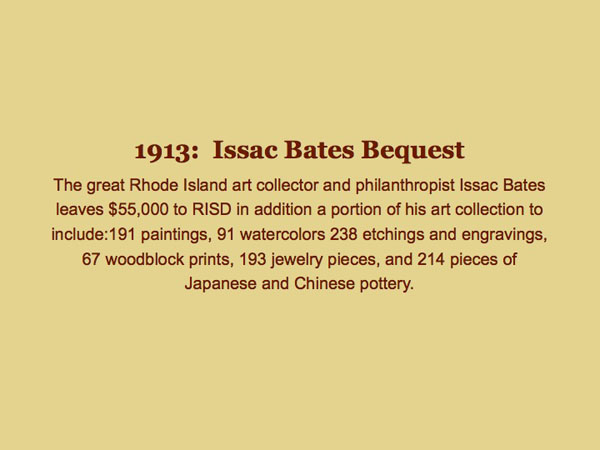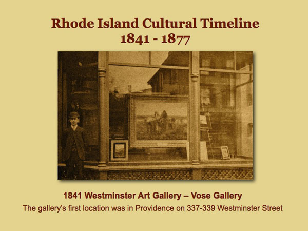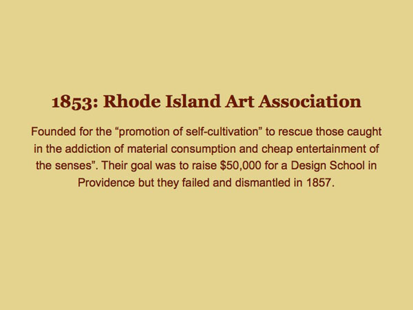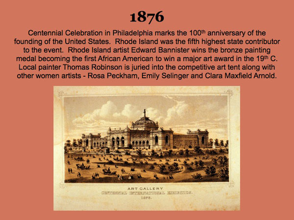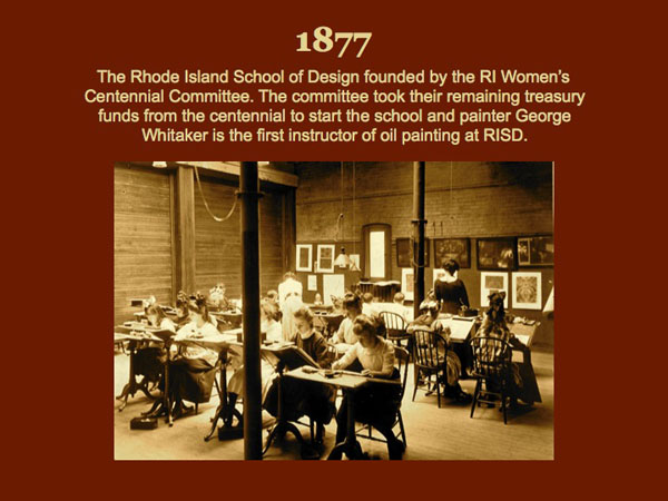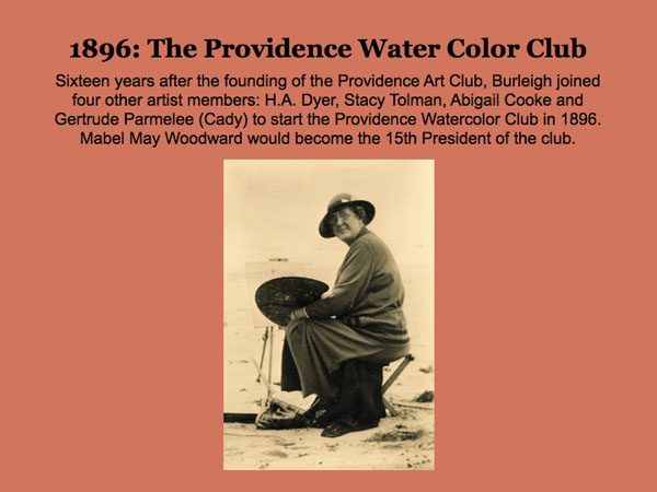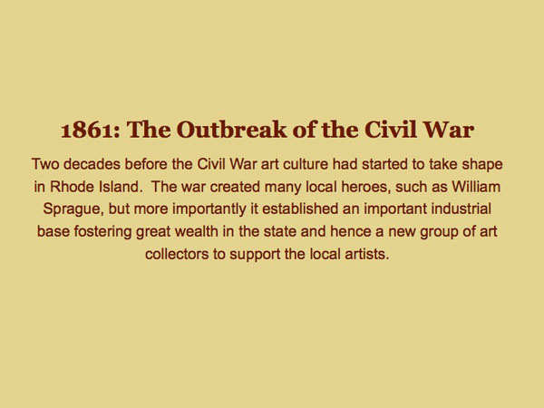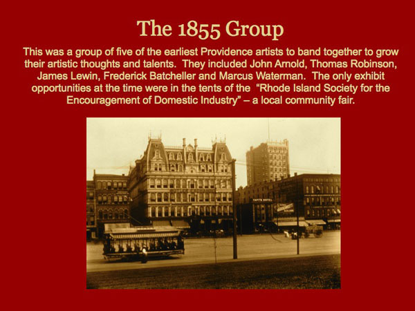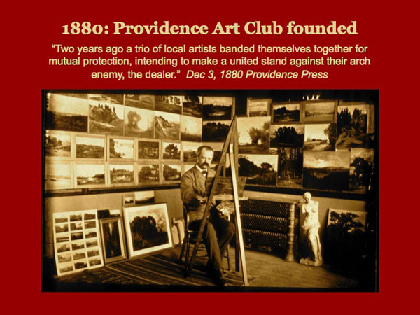This slide show is organized around a cultural timeline of important institutions founded to foster the arts in Rhode Island. The nineteenth century ushered in an era of great abundance for Rhode Island, by 1903 the state boasted of the highest per capita income in the United States. The infrastructure of industry was laid before the Civil War, primed to meet the demands of war and in peacetime made a remarkable adjustment, transforming the little state into one of the most formidable economic powerhouses in the nation. With this accumulation of wealth came a sense of responsibility for the greater good leading to impressive improvements in the physical and social institutions of Rhode Island. On the cultural front we saw the founding of art clubs, museums, historical societies that today continue their mission to promote the arts. But who were the visionaries and founders who laid the infrastructure of these institutions? This exhibit explores the artists and thinkers around the Providence Art Club, the Rhode Island School of Design, the Providence Water Color Club, the Newport Art Association and their synergy that was critical to the art-makers of the state.