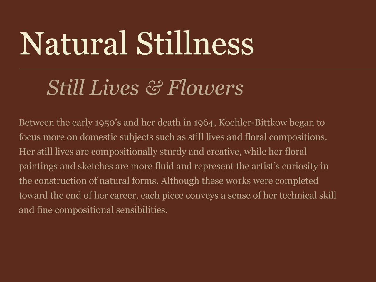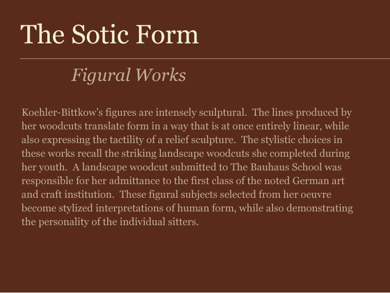 This small pocket exhibit explores the “virtuoso craftsmanship” of Albee and the “frank and riveting aesthetic” of Koehler-Bittkow. Each woman charting very different artistic paths within the same time period.