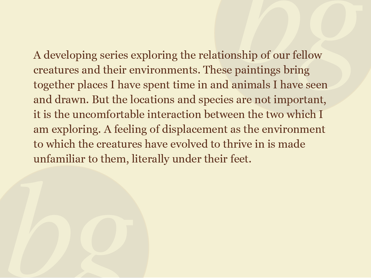 This exhibit features Kathy Hodge in process. An unusual exhibit for Hodge, a Bert Gallery staple for 14 years. Hodge usually never approaches the gallery until a focused series or theme is completed. Years of hard work have produced tightly conceived exhibits around important events and concepts in her life - a trip to Russia, the fleeting glances from a train window, and the remnants of a shoemakers shop. However, as this mature artist evolves she starts to question and ruminate over a new idea and direction: her love of nature, interest in taxidermy and a lineage of artist residences in national parks. Hodge questions where to turn, which ideas to pursue, how to evolve like the natural world around her and how to manage the flood of ideas and interests.