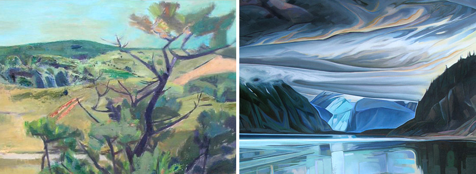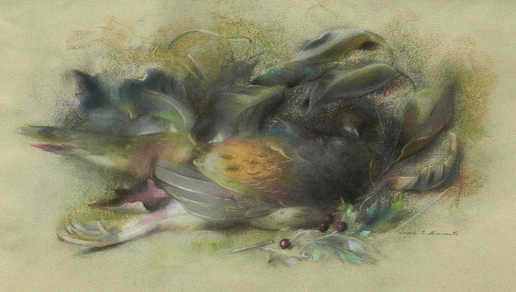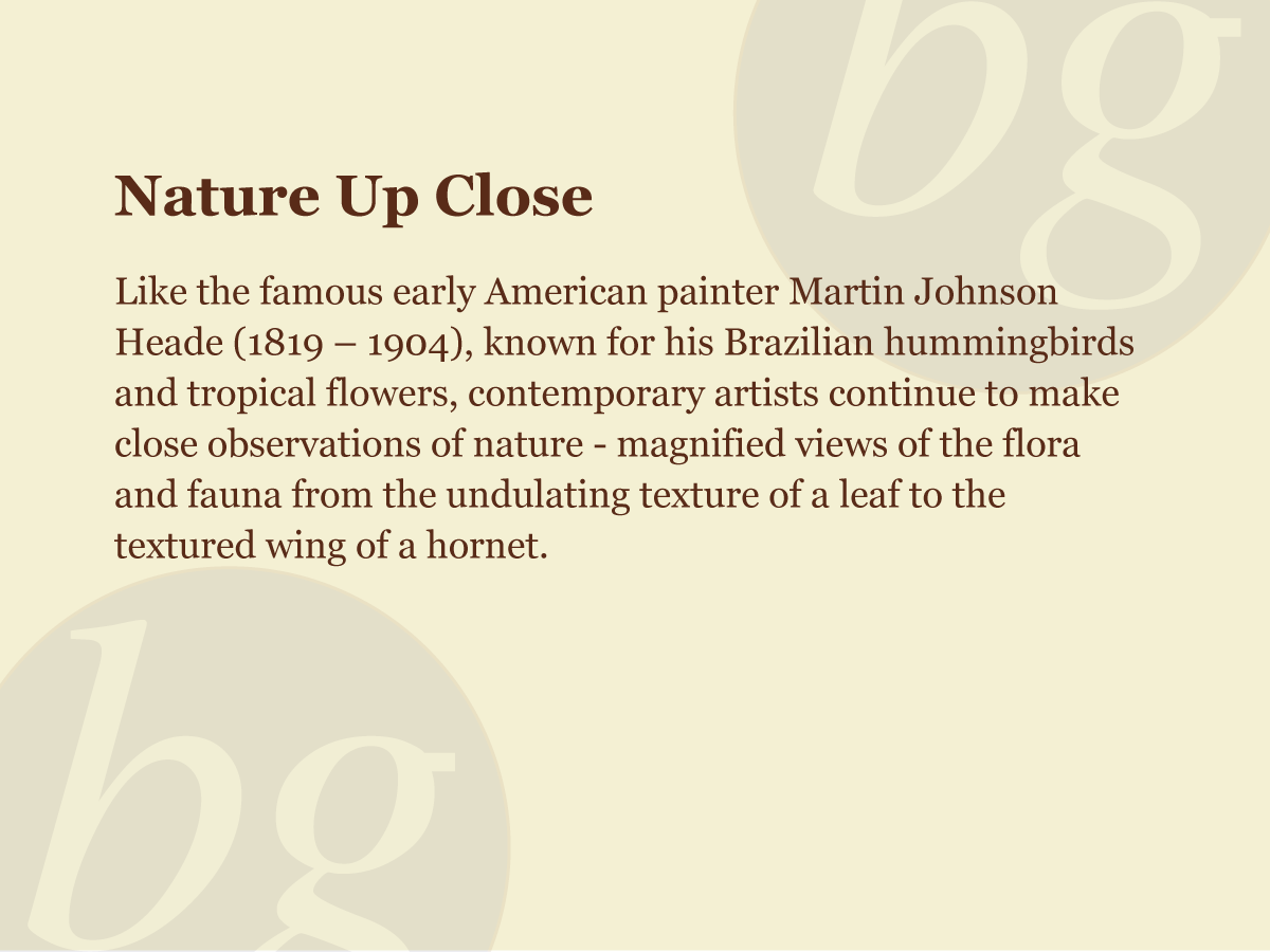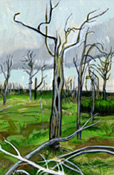 For other artists on exhibit, there is a concentration on the flora and fauna of the land. Louise Marianetti (1916 - 2009) is attracted to painting the decaying elements of earth. Then a selection of contemporary artists break loose and concentrate on specific elements in nature for Kenn Spesier it is the undulating texture of a leaf and for Kathy Hodge the microscopic examination of a bee and beetle.
