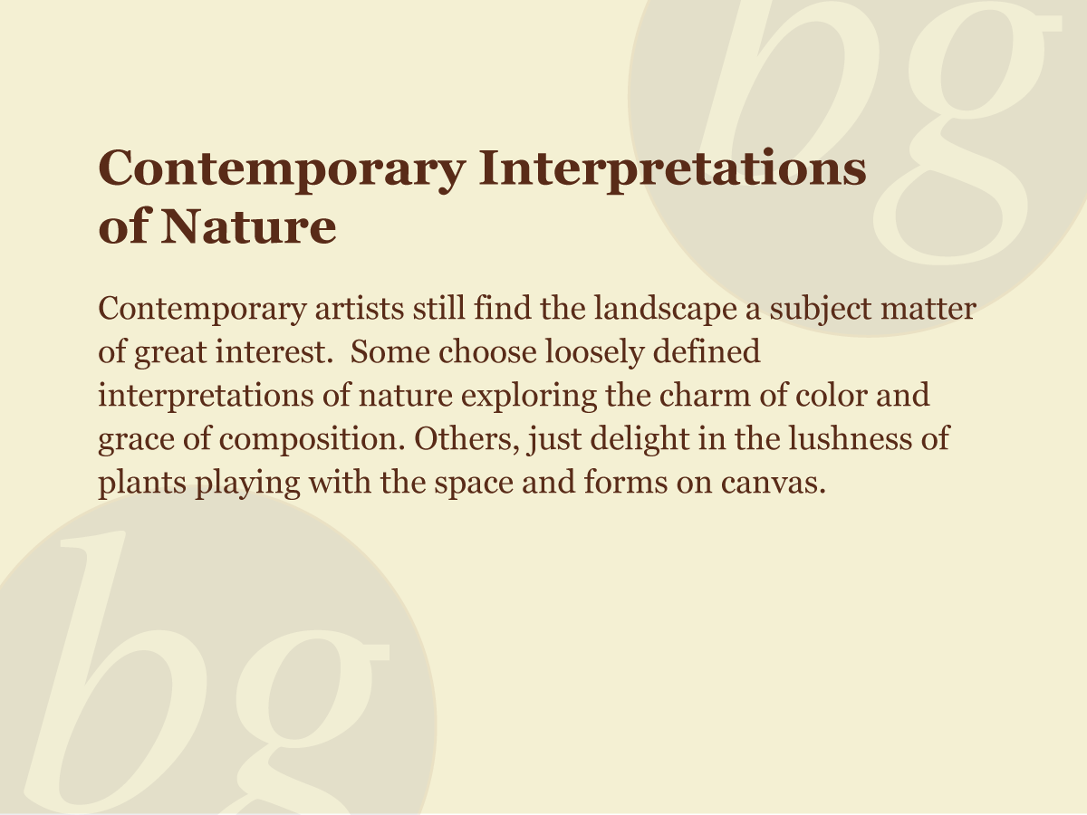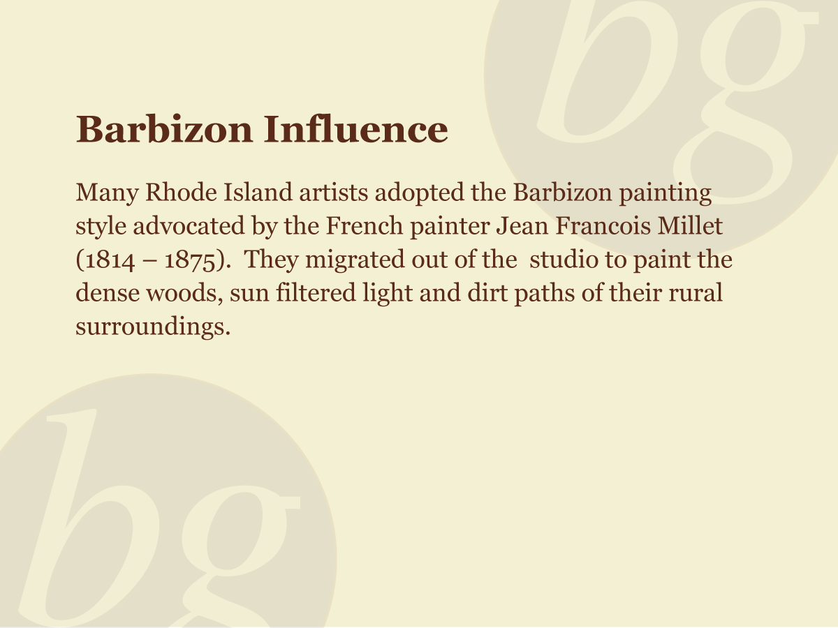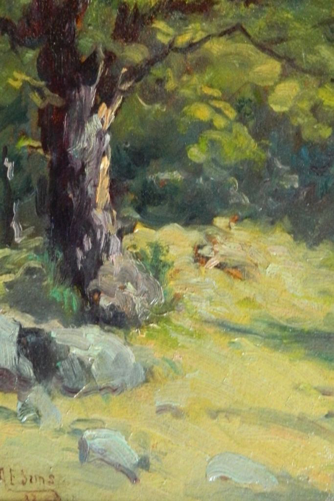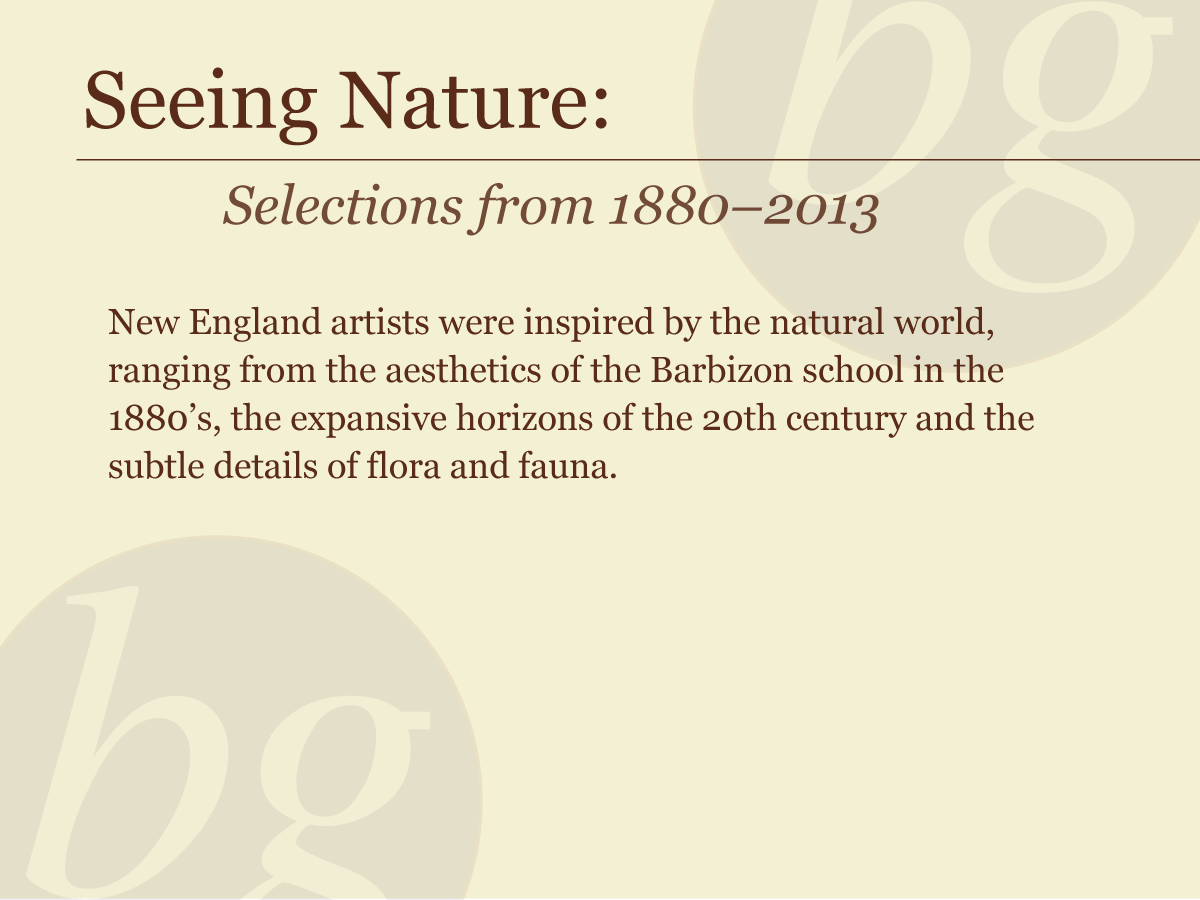 Seeing Nature: Selections from 1880 to 2013 includes early Rhode Island painters of the 1880’s who excelled in the aesthetics of the Barbizon school. Many Providence painters embraced a new radical approach to landscape paintings advocated by the French artist, Jean Francois Millet (1814 - 1875) who rejected popular academic and topographical painting of the land. Artists migrated out of the studio to nearby forests and fields to experience the dense woods, dirt paths and filtered sunlight. Both local artists Thomas Robinson (1834-1888) and George Whitaker (1841 - 1916) had first hand experience in the French forest of Fontainebleau, the mecca for Barbizon artists, painting the pleasures of nature and bringing those ideas back to fellow artists in Providence and Boston.