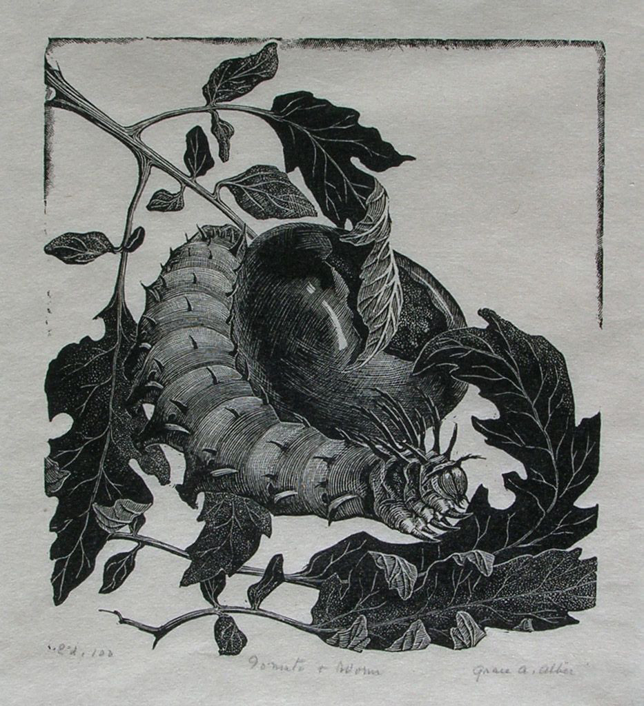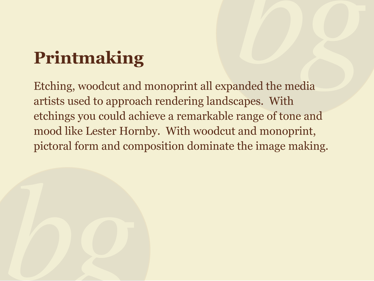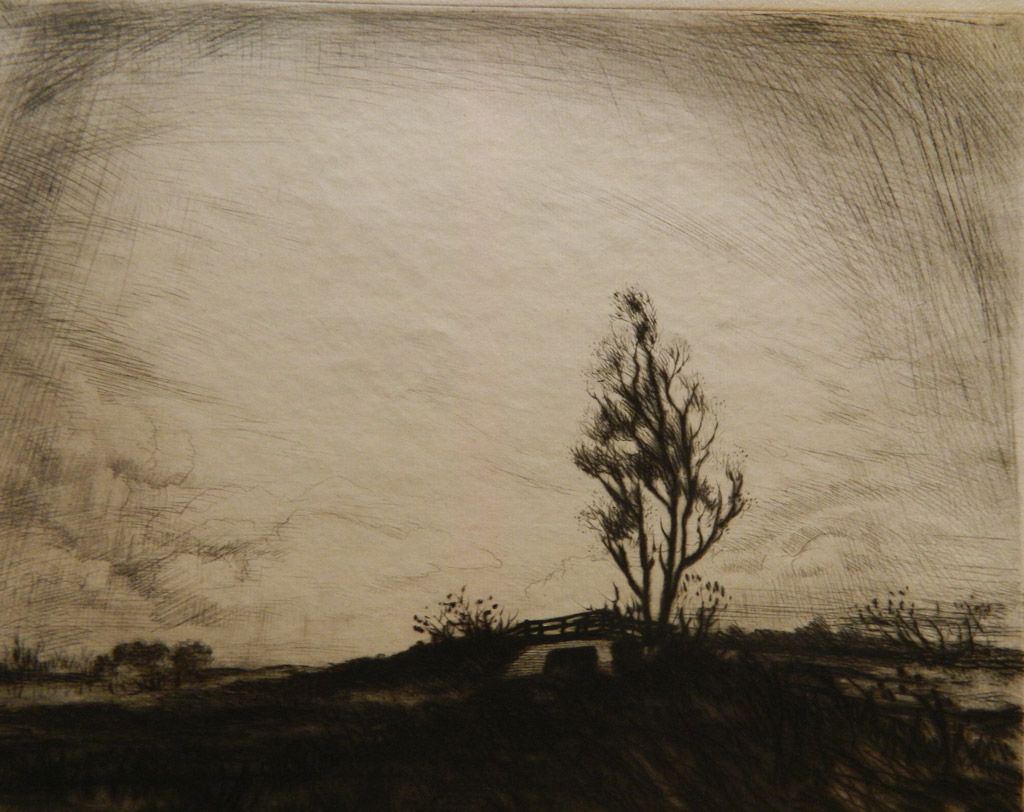 New England printmakers, like German emigrant Koehler-Bittkow (1887 - 1964) nurtured in the expressionist traditions of her heritage, were bent on capturing the direct, expressive elements of the land. While native Americans, Lester Hornby (1882 - 1956) and Grace Albee (1890 - 1956) perfected the etching and wood engraving media to seek the highly descriptive and detailed aspect of nature.