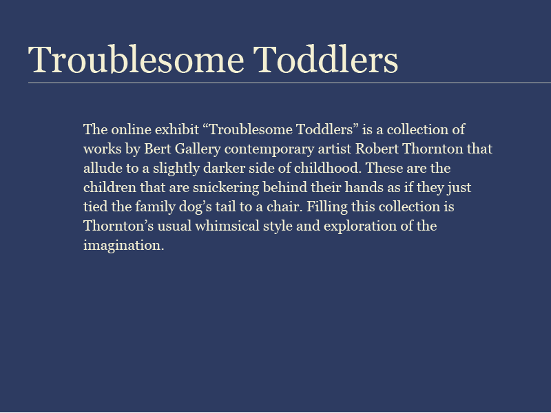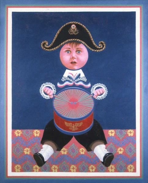 His early style, formed with a wry edge and cynical opinion of the human psyche, extends otherwise familiar forms of anatomy and places to create darkly humorous compositions where the 2-dimensional design overrides accurate portraiture. Later investigations capture even darker political themes, or provide contrast in the stormy softness of impressionistic Rhode Island seascapes.