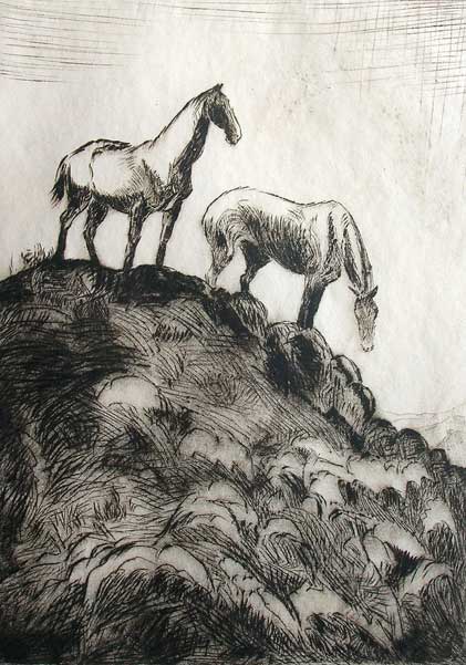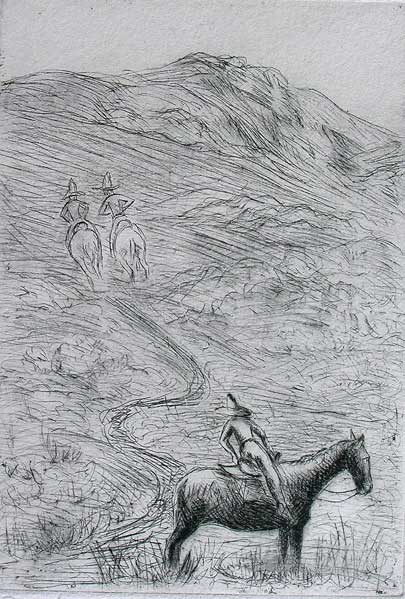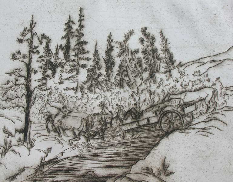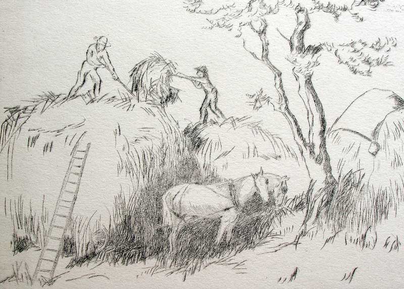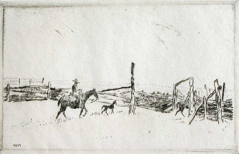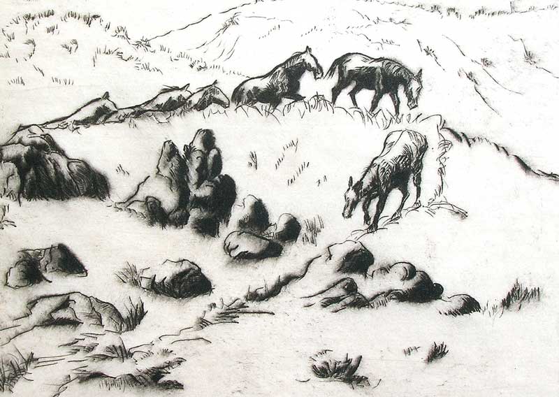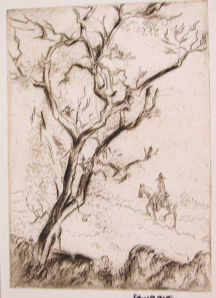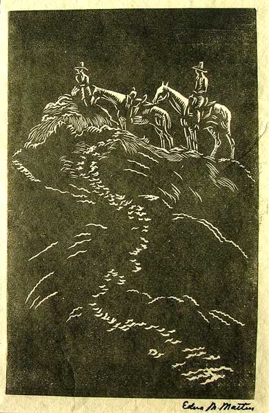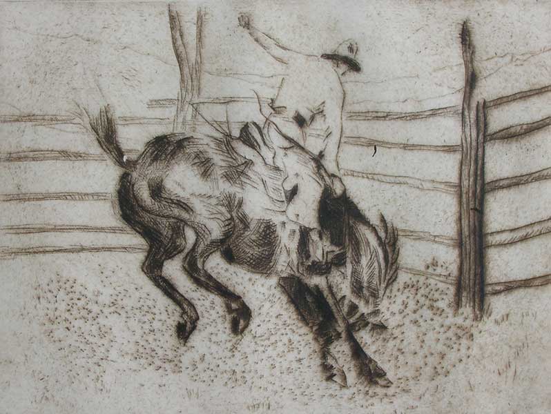 Martin’s love for the outdoors was evident throughout her life. In addition to teaching and making art, her daily life included horseback riding, hiking, and managing her family farm and all of its animals. During the summers of 1929 and 1931, Martin traveled to Wyoming and produced her most successful body of work. She returned with watercolors and etchings that highlighted the integration of her abilities in draftsmanship, printmaking and composition.